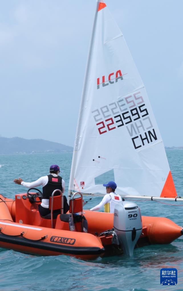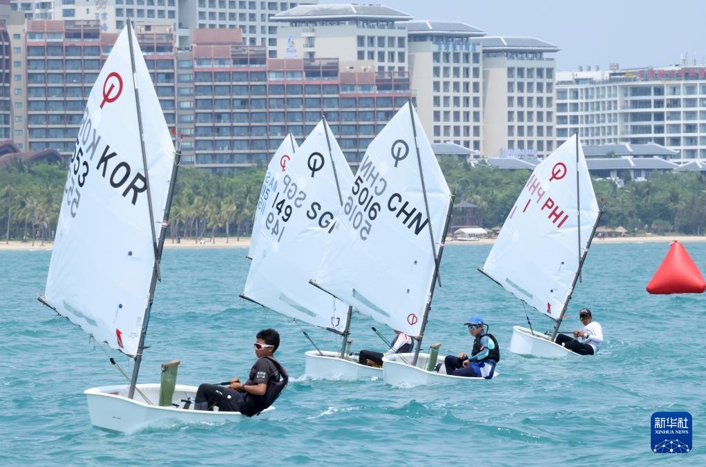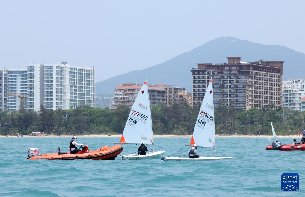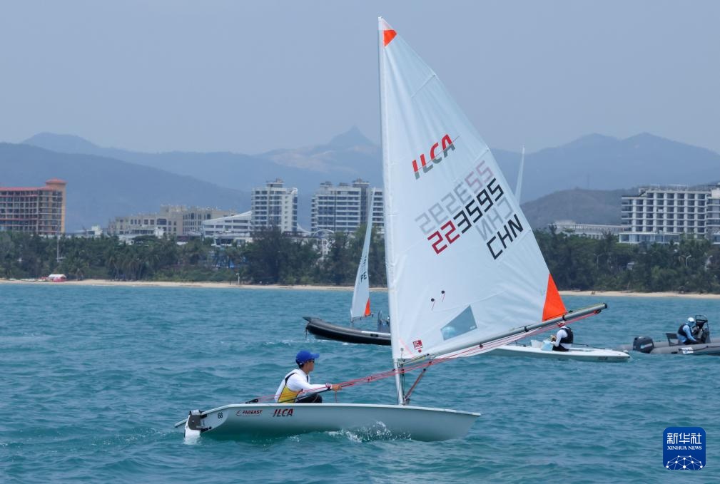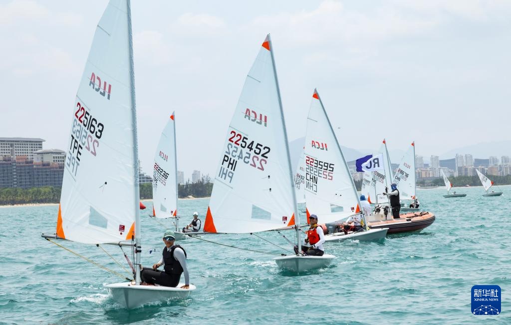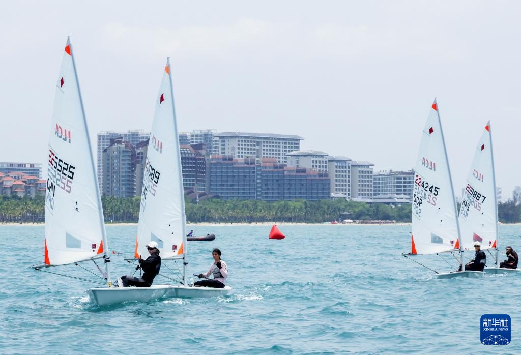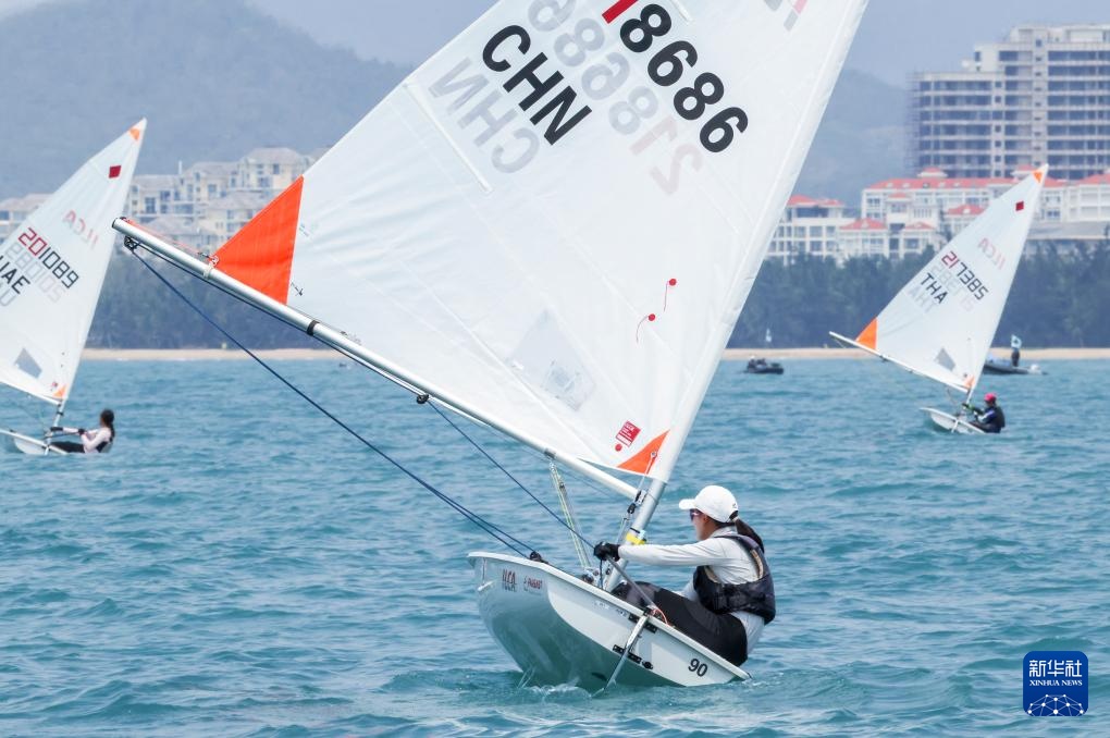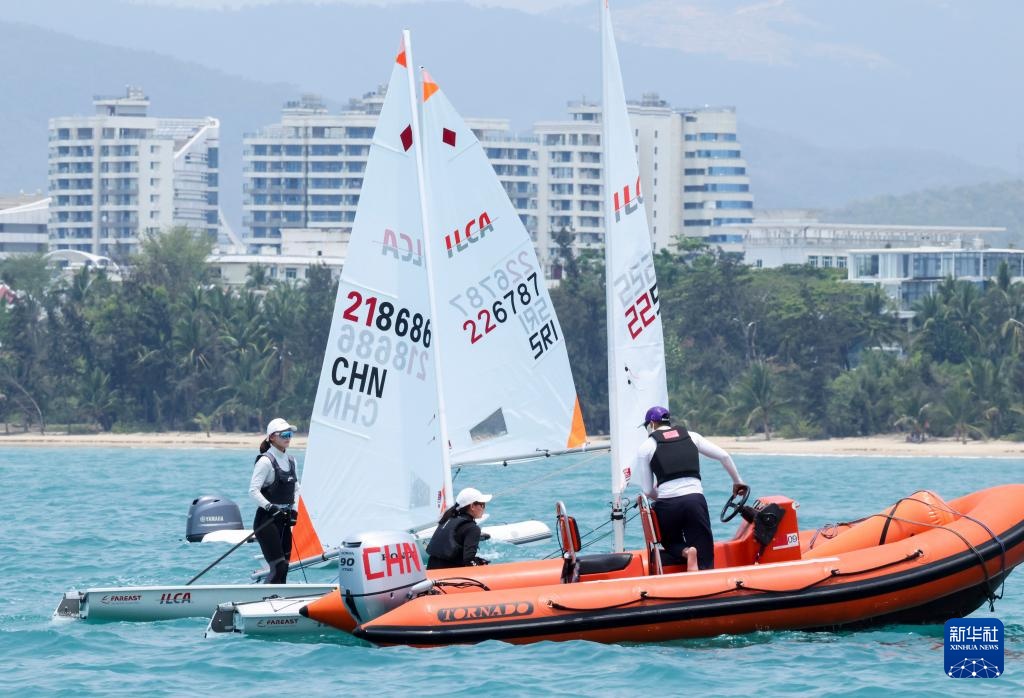 4月23日,中国选手颜果果(左一)在ILCA4帆船女子第1轮比赛中。新华社记者 张帆 摄