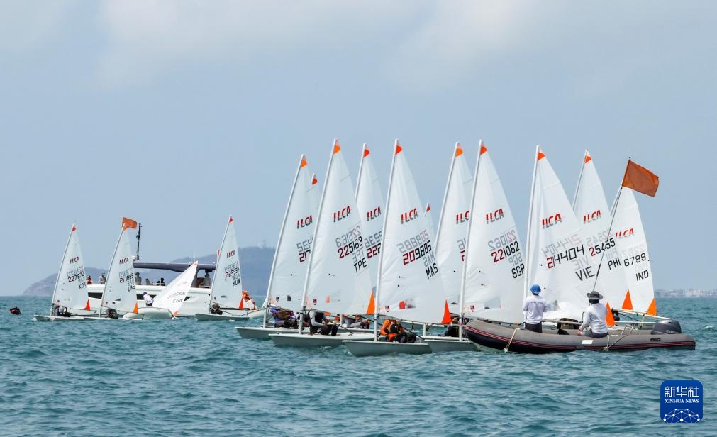 4月23日,选手们在ILCA4帆船男子第1轮比赛中出发。新华社记者 张帆 摄