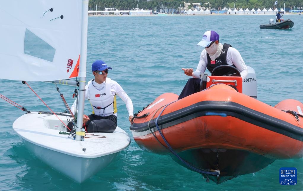4月23日,中国选手傅冯子熠(左)在ILCA4帆船男子第1轮比赛后与教练交流。新华社记者 张帆 摄